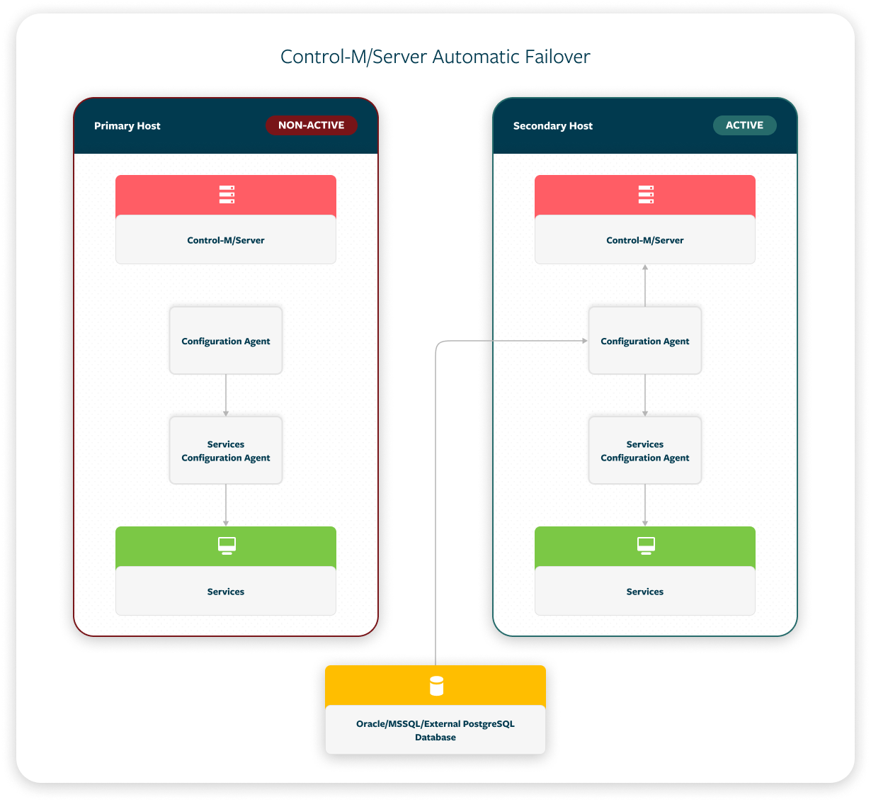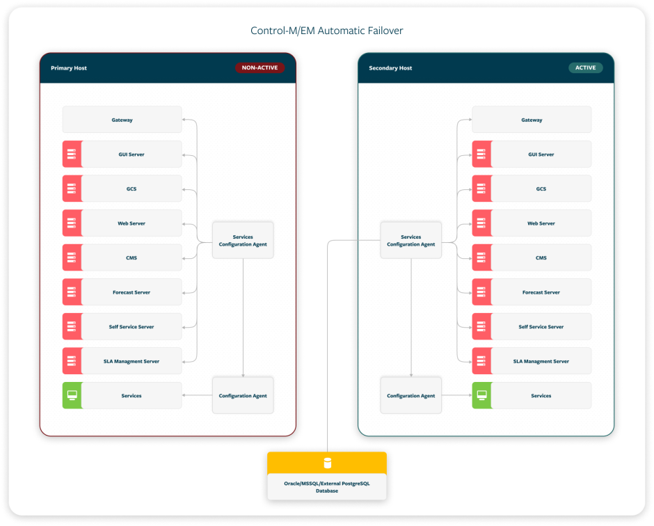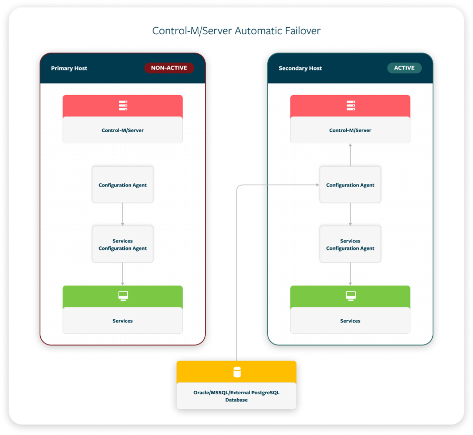 Automatic Failover: The secondary Configuration Agent automatically takes control and resumes production, when it detects that the primary Control-M/EM or Control-M/Server and its primary Configuration Agent have unexpectedly stopped.