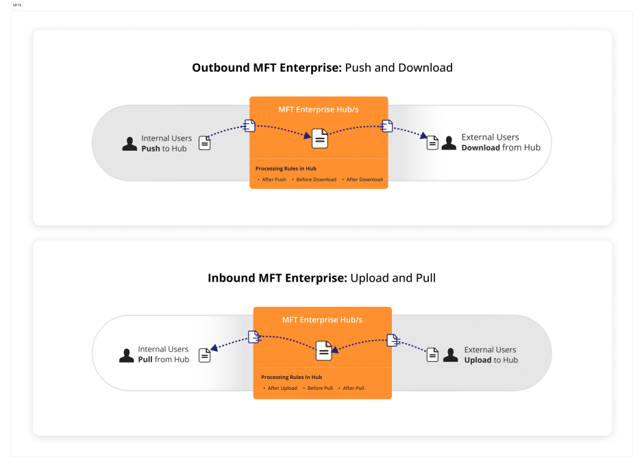 The following diagram shows how MFT Enterprise handles processing rules for uploaded or downloaded files by internal or external users.