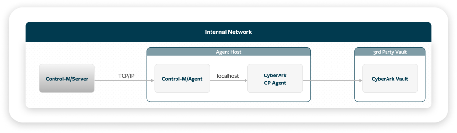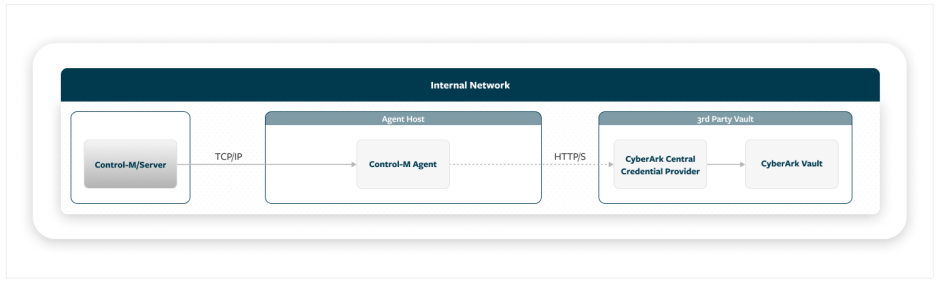 You can integrate Control-M with a CyberArk vault where you store and manage sensitive information (called secrets), such as passwords, access keys, or security keys. This integration enables Control-M/Agents to retrieve secrets from your vault only when they connect to your plug-in application servers and run jobs, so that sensitive information is not saved in Control-M components. Communication with the CyberArk vault can be either SDK communication through a local Credential provider (CP) installed on the Control-M/Agent host machine or REST communication through a central Credential Provider (CCP).